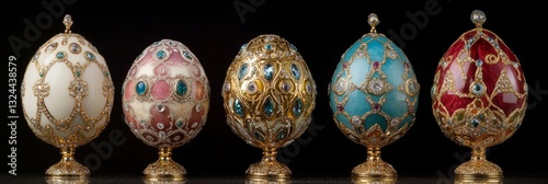 Five jeweled and decorated fabergé eggs stand on golden pedestals against a black background, creating a luxurious and elegant display