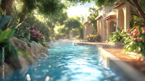 Sunlit lazy river flows past Mediterranean villas