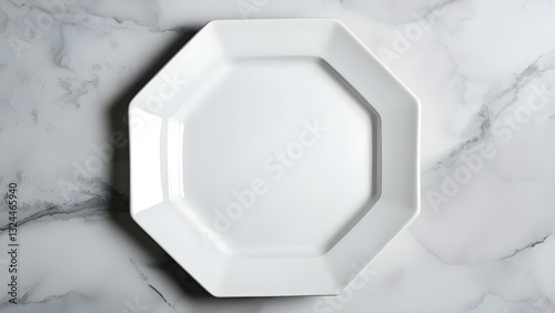 A plain white octagonal plate on a marble surface. Concept Ceramic Tableware, Minimalist Design, Octagonal Shape, Elegant Presentation, Marble Texture