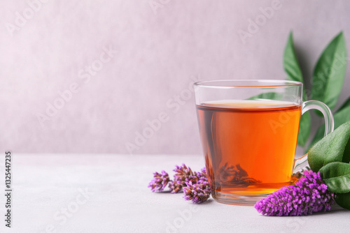 decoction of medicinal herbs in glass cup, surrounded by vibrant flowers and green leaves, evokes sense of tranquility and wellness