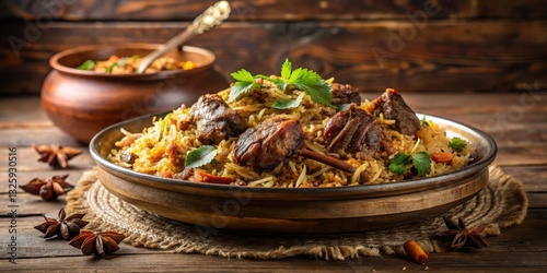 Steaming plate of aromatic mutton biryani on a wooden table with a hint of spice and herbs, spicy, Indian cuisine