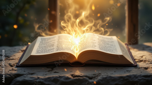An open book with a burning heart symbol on its pages radiates light, symbolizing inspiration or revelation within Christianity.