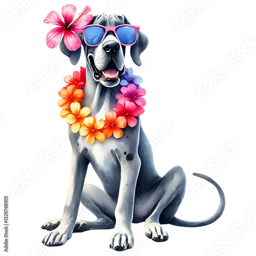 great dane dog wearing red sunglasses with star reflections and a colorful floral necklace, smiling with a hibiscus flower on the ear, tropical summer vacation with a pineapple
