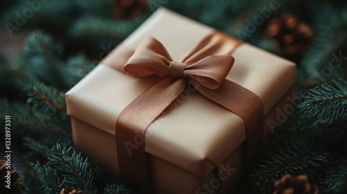 Beige gift box with ribbon on rustic wooden table surrounded by pine branches and soft natural light