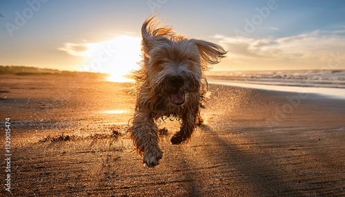 A scruffy terrier with fur sticking out wildly, tail wagging excitedly, running across a grassy field with joyful energy.