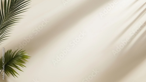 abstract background with palm leaf shadow on a white wall. Minimal summer scene for product presentation, empty mockup.