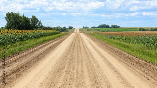 A rural dirt road surrounded by endless sunflower fields under a bright summer sky