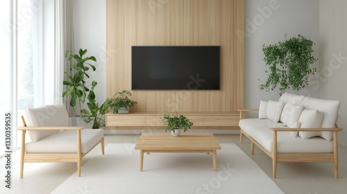 A peaceful minimalist living room with a white sofa, light wooden furniture, and a wood-grain TV wall