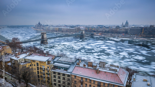 Budapest, Hungary - Panoramic skyline view of the Szechenyi Chain Bridge on the icy River Danube with Parliament and Bazilika at background on a winter morning