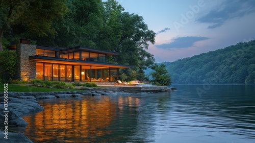 Modern riverside home at twilight. Serene waterfront retreat with contemporary design. Expansive windows offer stunning views
