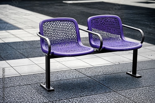 two purple plastic chairs with a textured patterned seat placed on a paved outdoor area dos sillas de plástico de color morado con un asiento de textura estampada colocadas en una zona exterior pavime