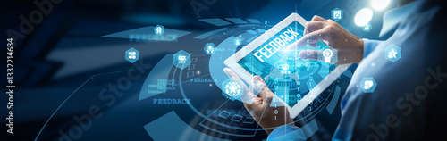 Feedback. A person is using a mobile digital interface, highlighting Feedback options to improve user experience by providing suggestions and reporting issues directly through the app.