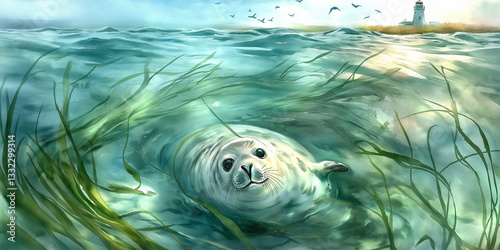 Fokę szara odpoczywająca na dnie Bałtyku, otoczoną roślinnością morską. Nad powierzchnią wody widać historyczne budynki, co może symbolizować związek człowieka z naturą. Akwarela.