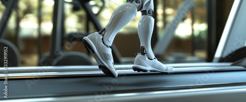 futuristic humanoid robot jogging on a gym treadmill to illustrate AI training and rapid development on a clear background - Stock