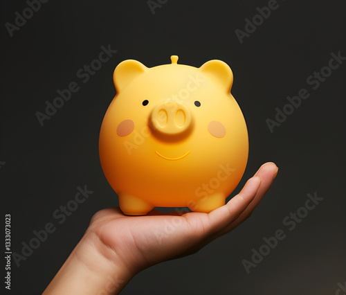 Żółta skarbonka w kształcie świnki trzymana na dłoni symbolizująca oszczędzanie.