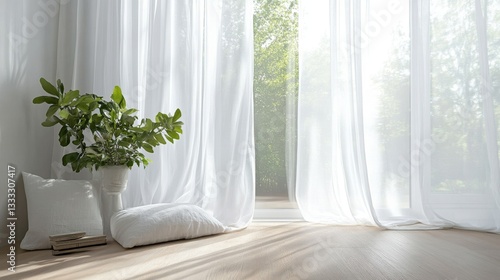 118.Clean and tranquil home interior with sheer white curtains hanging delicately by a tall window, diffusing light and adding a touch of elegance to the minimalist design.