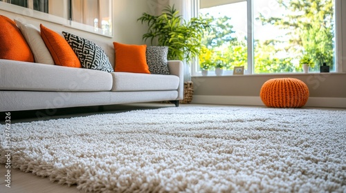 This inviting living room features a plush white rug and a stylish sofa adorned with orange cushions, creating a warm atmosphere. Sunlight filters through big windows, enhancing the homey vibe