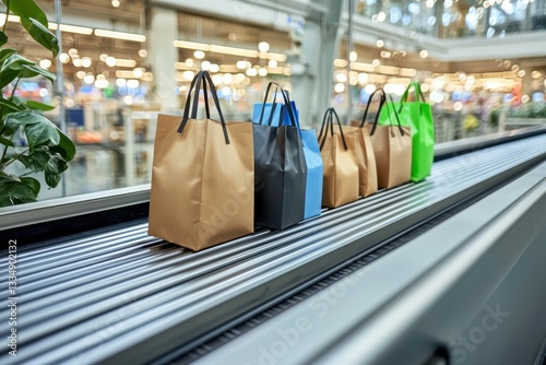 A row of colorful shopping bags on a moving walkway, showcasing retail shopping and consumerism in a modern shopping center with bright lights and blurred background.