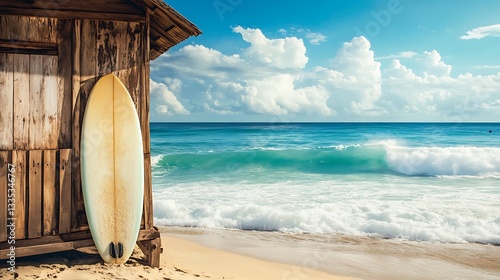 A surfboard resting against a beach shack with ocean waves