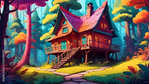 A whimsical illustration a charming wooden cabin nestled amidst a vibrant autumnal forest, featuring a stone pathway leading its entrance.
