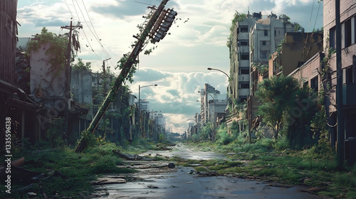 荒廃した未来都市の幻想的な風景イラスト