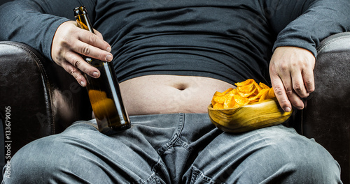 ein Mann sitzt in einem Sessel und ernährt sich ungesund von Bier und Kartoffelchips