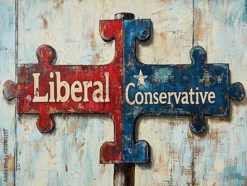Rustic wooden puzzle sign splits into "Liberal" and "Conservative," symbolizing political division, debate, and contrasting ideologies in modern society.