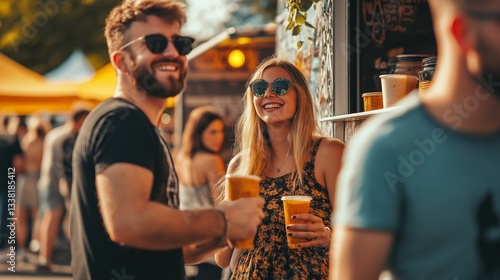 Lively group of friends savoring refreshing drinks at an outdoor festival, surrounded by colorful tents and a lively atmosphere filled with laughter and joy