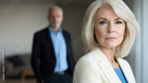 Woman and man in a professional setting with serious expressions