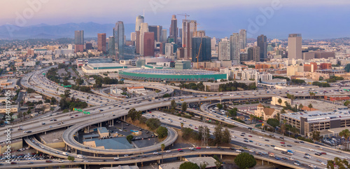 Aerial view of the Los Angeles skyline and freeway interchange in California, USA. Cars are traveling on the highway, connecting the city.