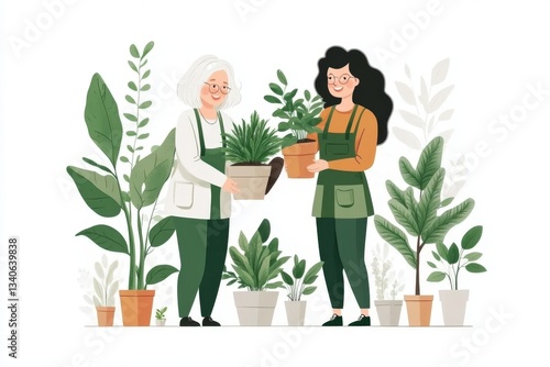 A whimsical flat drawing of a caregiver helping an elderly woman water her houseplants, with bright green leaves and cheerful expressions, on a white background