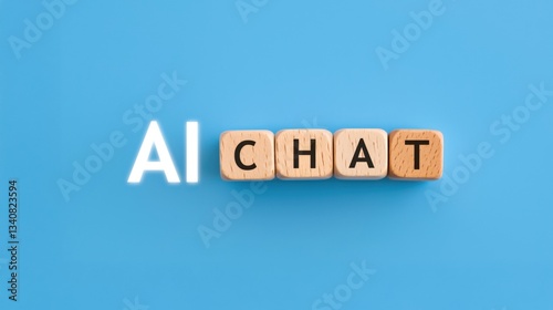 The image features wooden letter blocks spelling "AI CHAT" on a blue background, emphasizing the theme of artificial intelligence communication.