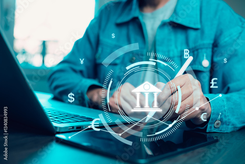 Businessman holding virtual world with currency sign for forex exchange and global money transfer by technology concept.