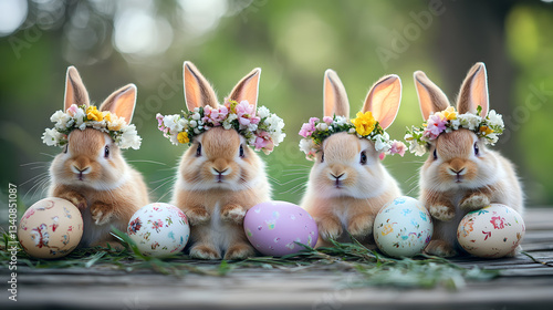Group of tiny rabbits with floral crowns sitting beside Easter eggs.