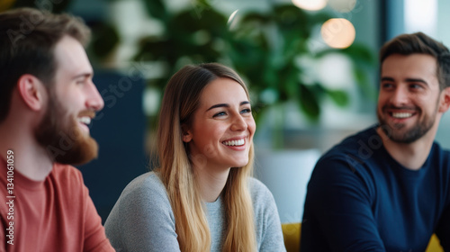 group of young professionals smiling and chatting in modern office breakout space, fostering positive and collaborative work environment