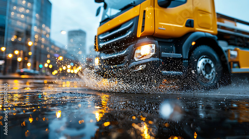 Street sweeper truck cleaning rainy city square urban environment action shot close-up perspective public hygiene efforts