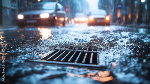 Flood water overflowing onto the road and entering a storm drain grate, vehicle navigating the flooded street amid rainfall. Flooding road, water draining into storm systems, efficient drainage met