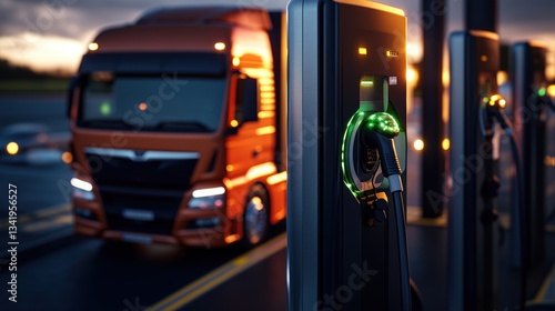 Electric truck charging station at sunset with modern charging infrastructure and truck in background