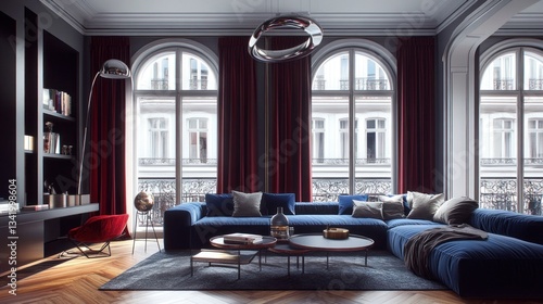 Luxurious Parisian living room with arched windows and burgundy drapes
