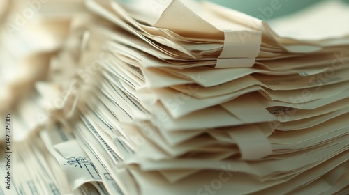 A Close-Up View of Disorganized Stacks of Brown Paper Documents with Clips, Illustrating Chaos and Paperwork Management in an Office Environment