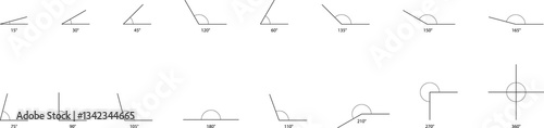 Angle icons set. 15, 30, 35, 45, 60, 90, 105, 110, 120, 135, 150, 180, 210, 270, 360 degrees measure. Geometric symbol. Mathematical elements.