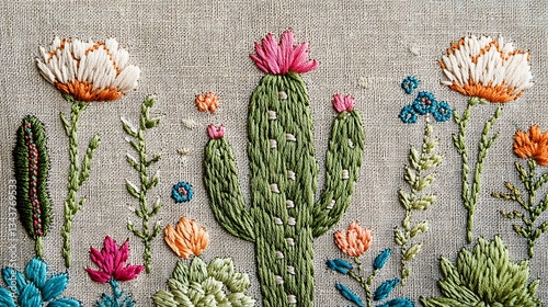 A close-up view of an embroidered cactus and succulents pattern, stitched onto a rustic linen fabric
