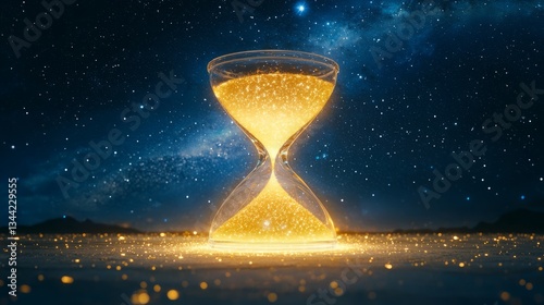 Time warp future parallel. A glowing hourglass filled with golden particles, set against a starry sky, symbolizes the passage of time and cosmic beauty.