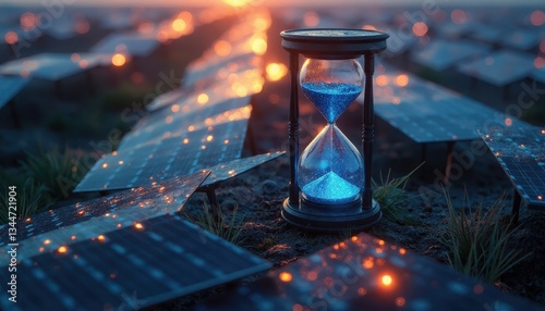 Hourglass surrounded by solar panels at sunset, symbolizing Earth Hour and renewable energy.