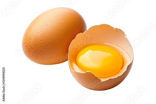Fresh brown egg with cracked shell and yolk on transparent background