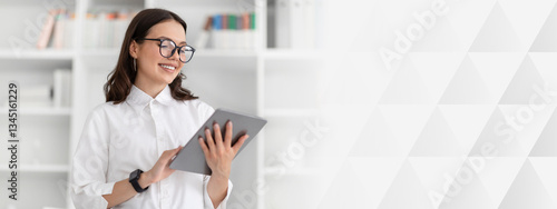 Glad young caucasian businesswoman in white shirt and glasses chatting on tablet in office interior. Business and gadget for work, official lifestyle, app and ad, offer, startup