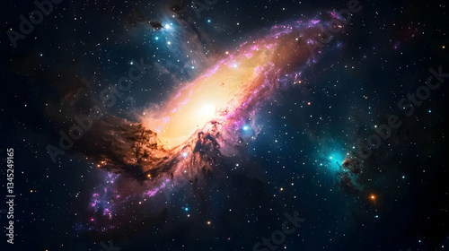 Spiral Galaxy In Deep Space Displaying Colorful Nebula and Bright Stars On Dark Background