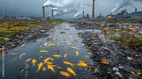 Goldfish swim polluted waterway, industrial background, environmental damage