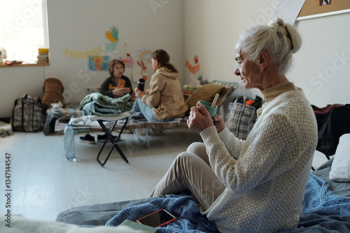 Side view of senior female migrant or refugee sitting on couchette and having tea in front of young woman and her son