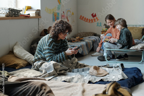 Young brunette woman in sweater and eyeglasses texting in mobile phone while sitting under blanket on sleeper in refugee camp